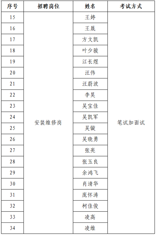 (三)根据招聘岗位数,在同岗位中依笔试成绩从高分到低分,安装维修岗按面试人数与招聘岗位数5:1的比例进行确定,勘探设计岗按面试人数与招聘岗位数3:1的比例进行确定,若达不到开考比例,则取消本次的招聘计划。最后一名如有多名考生笔试成绩相同的,一并确定为面试人员。