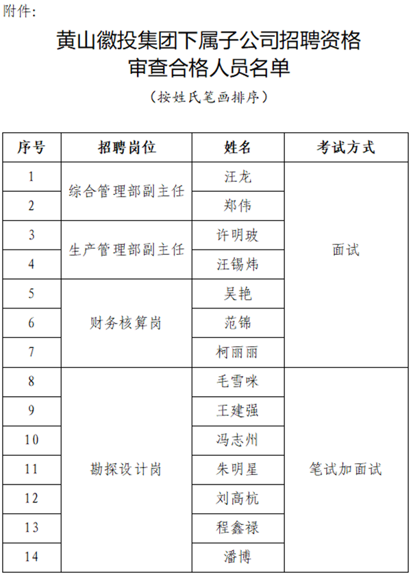 根据《黄山市徽城投资集团下属子公司招聘公告》,经本次招聘工作领导小组研究,采取面试和笔面相结合的两种方式进行,现就招聘人员考试有关事项公告如下: