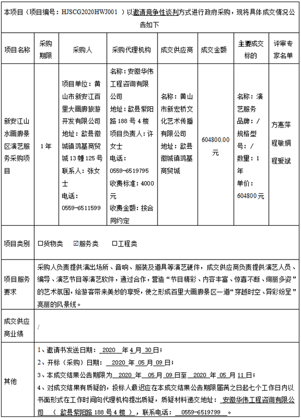 新安江山水画廊景区演艺服务采购项目成交结果公告