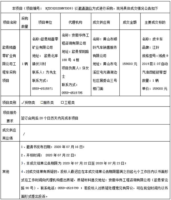 歙县陆壹零矿业有限公司工程车采购项目成交结果公告